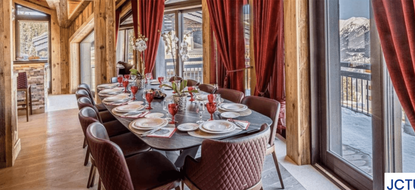 Esprit chalet traditionnel réinventé, 489 m² lumineux articulés autour d'une cheminée centrale et de grandes baies vitrées face aux montagnes. Jacuzzi, sauna, ski-room équipé et garage couvert : tout le confort d'un refuge alpin haut de gamme, dans l'intimité du quartier Plantrey.